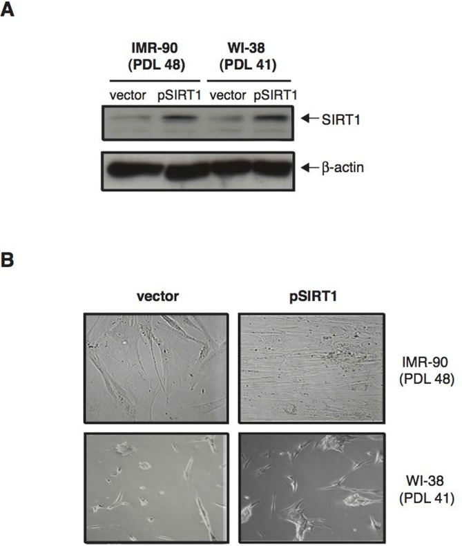 The correlation between increased SIRT1 levels and senescence retardation displayed by normal human diploid fibroblasts treated with CR-serum suggested that SIRT1 may play an important role in this process. To investigate the effects of SIRT1 modulation on senescence in these cells, we first induced SIRT1 overexpression in IMR-90 and WI-38 fibroblasts at a late passage number, and analyzed cells for the development of a senescent phenotype. To this end, IMR-90 (PDL 48) and WI-38 (PDL 41) cells grown in DMEM supplemented with 10% FBS were transfected with either a plasmid coding for SIRT1 (pSIRT1) or a control empty plasmid (Vector). As shown in Figure 5A, twenty-four hours after transfection, SIRT1 levels were significantly increased in pSIRT1-transfected cells compared to vector-transfected controls. Remarkably, after two weeks in culture, IMR-90 and WI-38 fibroblasts overexpressing SIRT1 displayed a significantly higher cellular density than control cells Fig. 5B). Thus, overexpression of SIRT1 in late passage human fibroblasts grown in medium containing FBS resulted in delayed senescent growth arrest.