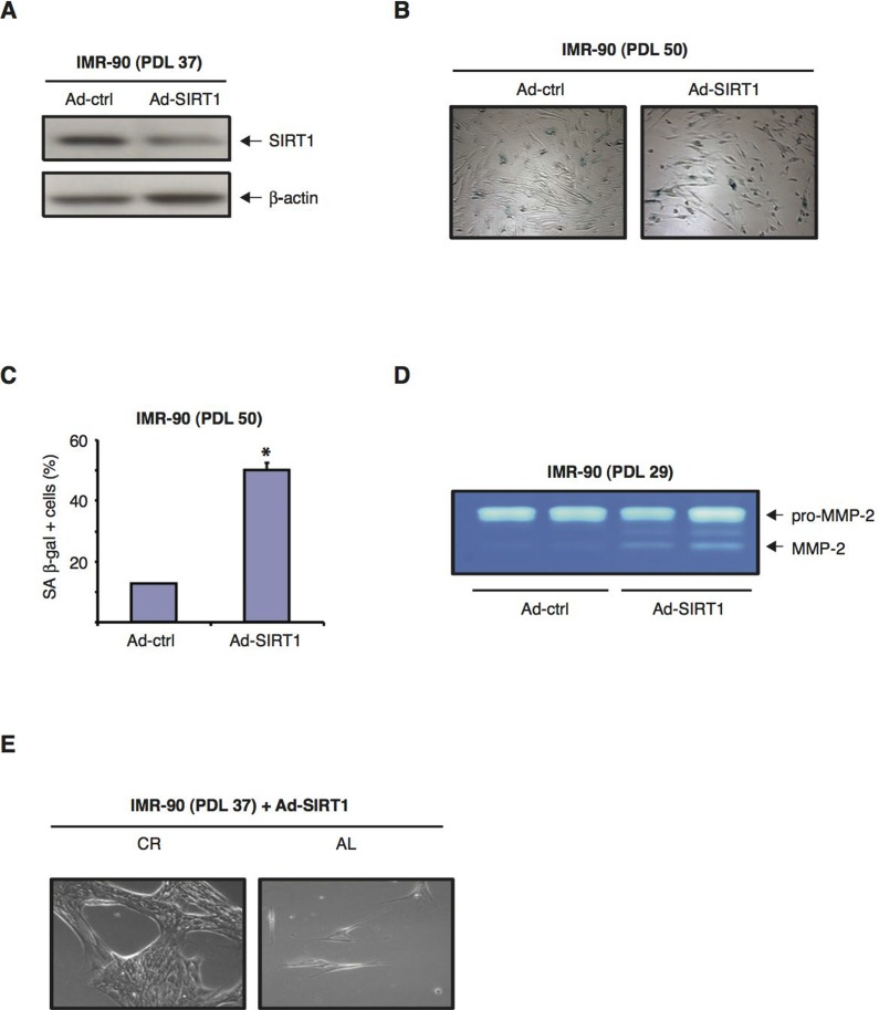 We then tested whether downregulation of SIRT1 levels in normal human fibroblasts could accelerate cellular senescence. To this end, IMR-90 cells were infected with Ad-SIRT1-siRNA, an adenoviral vector that has been shown to efficiently knockdown SIRT1 gene expression [38]. Immunoblot analysis showed that forty-eight hours after Ad-SIRT1-siRNA infection of IMR-90 (PDL 37), approximately 80% of the SIRT1 protein was downregulated when compared to SIRT1 levels in cells infected with an empty adenoviral control Fig. 6A). Similar results were observed with later passage IMR-90 (PDL 50) fibroblasts (data not shown). Interestingly, after 72 hours in culture in DMEM 10% FBS, the percentage of senescent IMR-90 (PDL 50) cells infected with Ad-SIRT1-siRNA was approximate-ly 4-fold higher than that of cells infected with the control adenoviral vector, as measured by SA-β-GAL expression Fig. 6B and C). Interestingly, the knock-down of SIRT1 in early passage IMR-90 cells (PDL 29) led to a significant increase in MMP-2 activation Fig. 6D). These results indicate that reduction of SIRT1 protein levels alone can have a significant impact on the development of senescence manifestations in normal human fibroblasts.