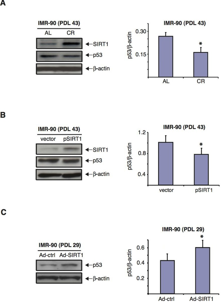Modulation of SIRT1 levels by either over-expression, knockdown or CR-treatment is associated with altered p53 levels