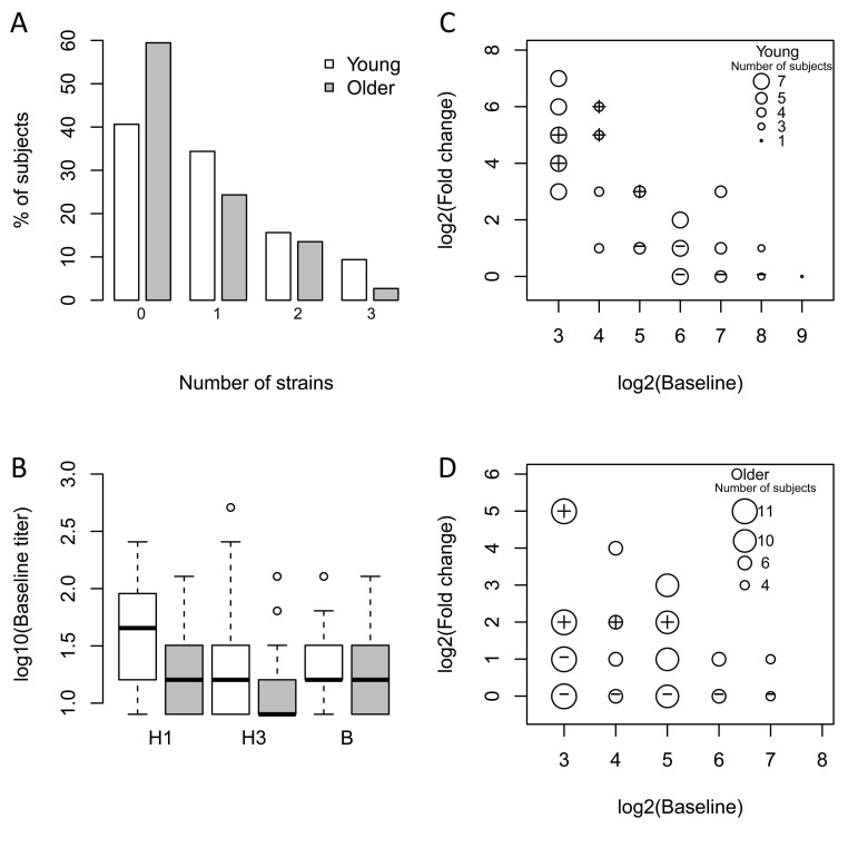 We have carried out the first systems-level assessment of alterations in gene expression prior to and following administration of the seasonal trivalent inactivated influenza vaccine including both young (age 21-30) and older (age ≥ 70) adults. We screened 121 participants to identify 51 young and older subjects who met a stringent definition of vaccine response (at least a four-fold increase in post- versus pre-vaccine HAI titer for at least two of three strains in the seasonal vaccine), or non-response (no four-fold increase in post-vaccine titer to any of the three vaccine strains). Consistent with previous observations, we found that older subjects are frequently non-responders to vaccine. Interestingly, young non-responders had higher baseline titers to at least one of the vaccine strains (frequently the H1N1 strain), suggesting in some cases that non-response could reflect inability to further increase an already elevated baseline HAI titer. We tried to minimize this potential effect through our selection of responders and non-responders. For example, the highest pre-vaccine titer found in a young non-responder analyzed in our cohort was 1:256 for one vaccine strain (Figure 1); however, the two other strains showed four- to eight-fold lower baseline titers and a lack of four-fold response. Similarly, the highest baseline titer found in an older non-responder was 1:128 for one strain, but the two other strains showed no change following vaccination with baseline levels eight- to sixteen-fold lower. Thus, using these stringent definitions of vaccine response and non-response, we sought to elucidate gene expression signatures associated with successful vaccine antibody response, and whether such signatures are affected by age.