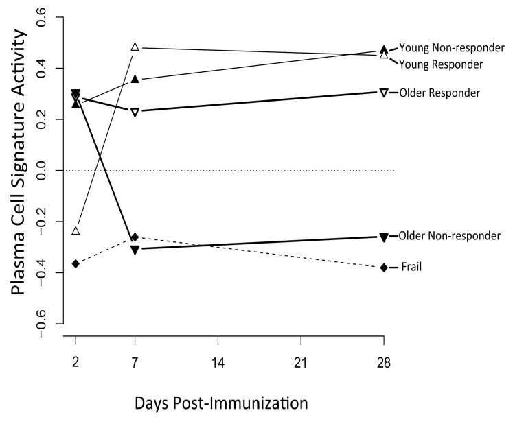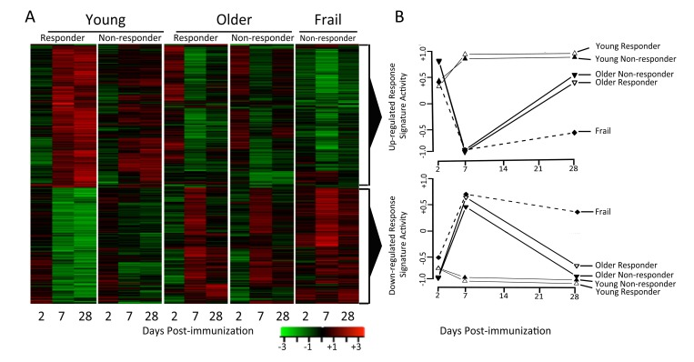 The response signature displayed a qualitatively different pattern of activity in older subjects, with significant activity observed at day 2 post-vaccination (q<0.05), followed by a trend toward down-regulation on day 7 and then up-regulation on day 28 (Figure 2). Interestingly, the response signature was never significantly induced at any time-point in frail individuals (Figure 2). These patterns in older adults were independent of vaccine response status, and were confirmed for young responders and older non-responders in the 2010-11 cohort (data not shown).