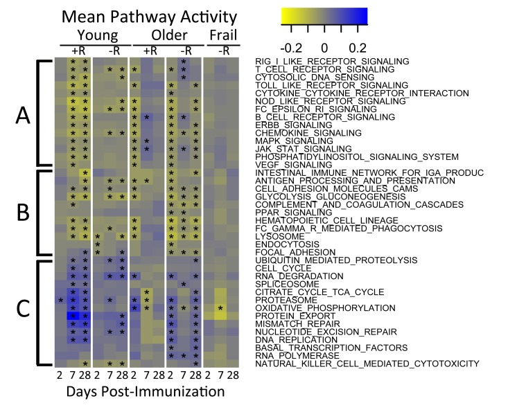The second cluster was slightly up-regulated on day 2 in young subjects and was down-regulated on day 7 and 28. Notably, in older and frail adults, up-regulation of this cluster was delayed until day 7. Pathway analysis of this cluster revealed activation of several immune pathways such as NOD-like receptor signaling and T cell and B cell receptor signaling.