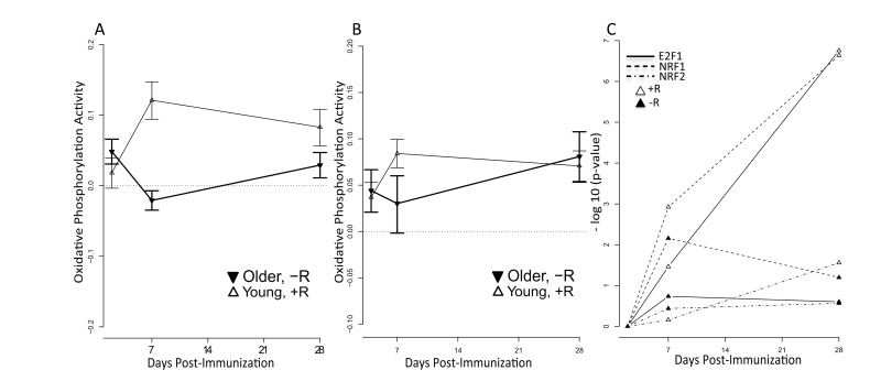 The identity of the cell type(s) responsible for the OXPHOS signature remains to be determined. In this regard, it is notable that metabolic differences have been reported in T cell subsets, with a predominance of oxidative phosphorylation associated with resting or memory T cells and aerobic glycolysis associated with activation and T helper subsets [22]. Thus, the OXPHOS signature could reflect metabolic priming in memory T cells; however, activation of another T or B cell subset(s) remains possible. This signature could also indicate a need to alter mitochondrial biogenesis or dynamics to properly activate innate immune responses, as mitochondria are critically involved in innate immune signaling [23]. Nonetheless, the OXPHOS signature could serve as a biomarker for a successful vaccine response, and raises the possibility that interventions targeting mitochondrial pathways could enhance vaccine efficacy in older adults. One potential example of such an agent would be bezafibrate, a compound used to treat hyperlipidemia that stimulates mitochondrial biogenesis through its activity as a PPAR agonist [24]. In addition, mitochondria-derived reactive oxygen species (mROS) are required for normal physiology and cellular signaling [25], and could be modulated during aging. Several lines of evidence point to a role of mROS in proliferation and production of IL-2 following TCR/CD28 stimulation, indicating that mROS are required during early stages of T cell activation. Additionally, oral administration of antioxidants in mice reduced the expansion of T cells following viral infection, suggesting that ROS are required for T cell function in vivo [26]. These results, coupled with our findings, suggest that the enhanced expression of OXPHOS genes upon vaccination may be required to rewire mitochondrial metabolism to fine-tune mROS levels, thus properly licensing antigen receptor signaling and activation of T and B cells. Integrating these transcriptional profiling data with genotyping information could provide further insights [27]. Additional experiments should also clarify whether alternate formulations of influenza vaccine developed for older adults, such as high-dose or intradermal preparations [28], are able to modify these alterations in gene expression.