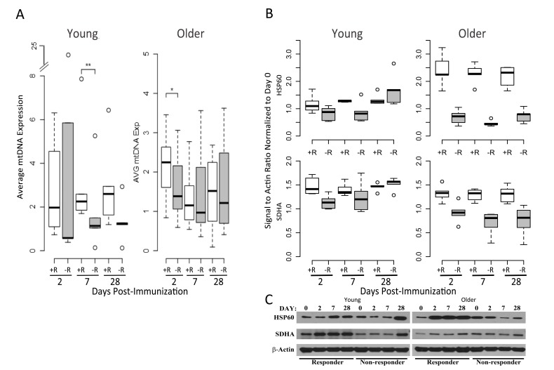 Approximately 1× 106 PBMCs were treated with cell lysis buffer (Cell Signaling Technology) from a subset of 5 young responders, 5 young non-responders, 5 older responders, and 5 older non-responders for which sufficient cell amounts were available. Lysed samples were briefly sonicated, and kept on ice for an additional 10 minutes. Lysates were mixed with 2x Laemmli Sample buffer, boiled and loaded onto 4-20% mini protean ready gels (BioRad). Following transfer, membranes were blocked with 5% milk powder in 1X TBS-tween 20 buffer at room temperature for 1 hour. Blocked membranes were incubated with primary antibodies against human HSP60 (Cell Signaling Technology), Succinate Dehydrogenase (SDHA) (Cell Signaling Technology) and HRP conjugated beta actin (anti-human beta-actin, Sigma), following by an HRP conjugated anti-Rabbit secondary antibody (Cell Signaling Technology) in 1x TBS-tween 20 containing 5% milk powder. Membranes were washed and developed and pixel intensities of the specific protein band and corresponding actin band on autoradiographs were estimated using ImageJ software. The relative pixel intensities (signal/actin) were plotted and statistical significance evaluated using a t-test.