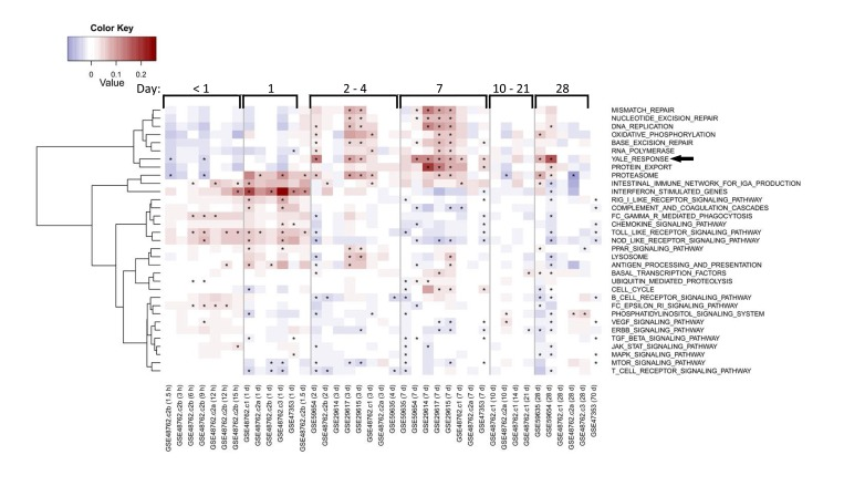 RNA samples were processed and hybridized to HumanHT-12v4 Expression BeadChip (Illumina San Diego, CA), NCBI RefSeq Release 38 (November 7, 2009) and selected from GenBank, dbEST, and RefSeq. Arrays were processed at Yale's Keck Biotechnology Resource Laboratory and raw expression data were output by the Illumina GenomeStudio software. Microarray data are available through the Gene Expression Omnibus (GEO) Database, accession number GSE59635 and GSE59654. The data were Quantile normalized. Genes with multiple probes were collapsed to keep genes (official gene symbol) with highest average expression within differentially expressed genes. Pathway activity was calculated using QuSage [34] upon collapsing multiple probe ids mapping to a single official gene symbol. Differential expression was defined for each gene at each post-vaccination time-point using two criteria: (1) an absolute fold-change of at least 1.25 relative to pre-vaccination time point and (2) a significant change in expression by LIMMA (BioConductor (doi: 10.1186/gb-2004-5-10-r80.) implementation) after correction for multiple hypothesis testing (q <0.05). Differentially expressed genes were grouped into two clusters using hierarchical clustering by ward. All of this analysis was performed using BioConductor software packages (doi: 10.1186/gb-2004-5-10-r80) in R.