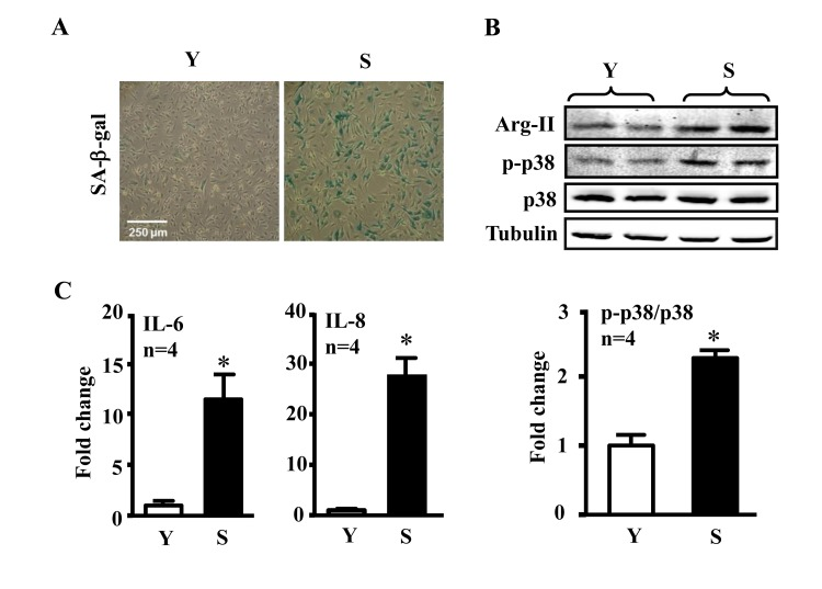 Our previous study showed increased Arg-II expression and activity in the senescent ECs [4]. We confirmed this result in our current study and showed further that the senescent ECs which reveal increased activity of SA-β-gal (Fig. 1A), had also enhanced activation of p38 as demonstrated by increased levels of phosphorylated p38, i.e., p38-Thr180/Tyr182 (p-p38) as compared to the young cells (Fig. 1B). The increased activation of Arg-II and p38 was associated with enhanced secretion of the inflammatory cytokines IL-6 and IL-8 measured in the conditioned medium from the senescent cells as compared to that from the young cells (Fig. 1C).
