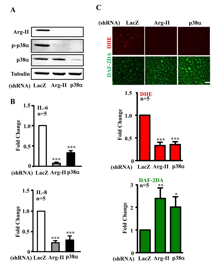 We further investigated whether Arg-II and p38 interact with each other and promote cytokine secretion in senescent endothelial cells. As shown in Fig. 2A, shRNA-mediated silencing of Arg-II in the senescent endothelial cells inhibited activation of p38α, the proapoptotic isoform of p38 in human endothelial cells [33]. Conversely, silencing p38α in the cells also inhibited Arg-II expression. The results implicate a positive crosstalk between Arg-II and p38 signaling. The production of IL-6 and IL-8 in senescent ECs as measured in the conditioned medium was reduced by silencing either Arg-II or p38α (Fig. 2B). Moreover, silencing either Arg-II or p38α in the senescent endothelial cells decreased superoxide anion production (DHE staining) and increased NO signal (DAF-2DA staining) (Fig. 2C), demonstrating a role of Arg-II-p38 crosstalk in endothelial dysfunction.