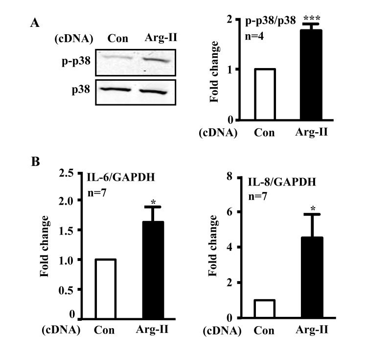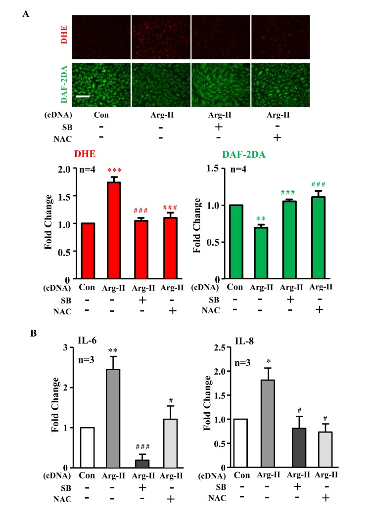 RPMI-1640 was purchased from Amimed (Muttenz, Switzerland) ; Endothelial cell growth supplement (ECGS) pack was from PromoCell GmbH (Allschwil, Switzerland) and all cell culture media and materials were purchased from Gibco BRL (Lucerne, Switzerland); BLOCK-iTTM Adenoviral RNAi Expression system was from Life Technologies (Zug, Switzerland); ELISA MAXTM Deluxe sets for human and mouse Interleukin-6 (IL-6), human Interleukin-8 (IL-8), mouse keratinocyte-derived chemokine (KC, the murine IL-8 homologue) were purchased from Biolegend (Lucerne, Switzerland); p38 inhibitor SB203580 (4-[4-Fluorophenyl]-2-[4-methylsulfinyl-phenyl]-5-[4-pyridyl]1H-imidazole) was purchased from Calbiochem (Lucerne, Switzerland); Bio-Rad DCTM protein assay kit was from Bio-Rad Laboratories (Basal, Switzerland); rabbit anti-phospho-p38mapk (pThr-180/pTyr-182) antibody was from Cell Signaling Technology (Allschwil, Switzerland); and mouse anti-p38mapk antibody was from BD biosciences (Allschwil Switzerland); anti-Arg-II antibody was from Santa Cruz Biotechnol (Basel, Switzerland); N-Acetyl-L-cysteine (NAC) and anti-α-tubulin antibody was from Sigma (Buchs, Switzerland); Alexa Fluor680-conjugated anti-mouse IgG (A21057), dihydroethidium (DHE) were from Molecular Probes/Invitrogen (Lucerne, Switzer-land), and IRDye800-conjugated anti-rabbit IgG (926–32211) were from LI-COR Biosciences (Bad Homburg, Germany); the membrane-permeable 4,5-diamino-fluoresceine diacetate (DAF-2DA) was from VWR international SA (Dietikon, Switzerland).