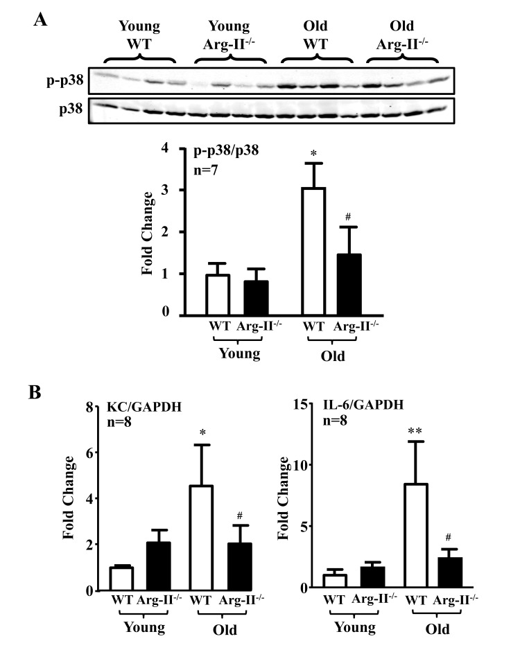Arg-II deficiency prevents p38 activation and vascular cytokine production in aged mice