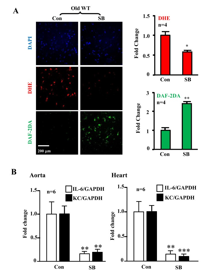 The levels of p38-Thr180/Tyr182 phosphorylation (pp38) in the aortas were significantly higher in the old WT mice as compared to the aged-matched Arg-II−/− mice, whereas Arg-II deficiency did not affect p38 activation in young mice (Fig. 5A). Gene expression of KC (IL-8 homologue in mouse) and IL-6 in the heart (aortas are not analyzed due to shortage of materials) was significantly elevated in the old mice, which was alleviated in the age-matched Arg-II−/− mice (Fig. 5B). Moreover, treatment of the intact aortas and hearts of old WT mice with SB203580 (10 μmol/L, 6 hours) improved eNOS function, i.e., inhibited superoxide anion production and enhanced NO generation (Fig. 6A), and reduced IL-6 and KC expression (Fig. 6B).