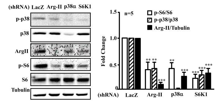 In senescent endothelial cells in which there is a high activity of p38, Arg-II, and S6K1, silencing Arg-II reduced p-p38 and p-S6 levels (Fig. 7A and 7B).