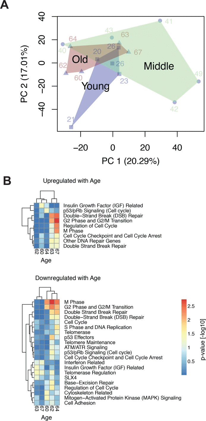 Microarray analyses of transcriptomes and biostatistic GSEA analysis of age-related differences in gene expression were done as previously described [20]. Gene sets for analysis were obtained from five RT2 RNA QC PCR Array® (SaBiosciences, Qiagen) gene panels for Human Cell Cycle, DNA Damage Signaling Pathway, DNA Repair, Cellular Senescence and Telomeres and Telomerase. The Genes associated with each gene set are listed in Suppl. Table I. Complete data files can be obtained from Gene Expression Omnibus under the submission ID GSE55118.