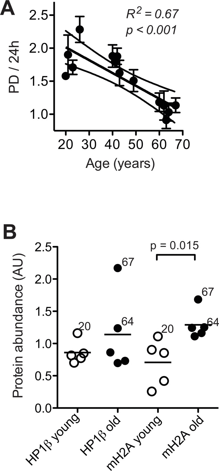One possible explanation for the above divergence could be differences in heterochromatin formation. We have demonstrated in Fig. 2A that expression of heterochromatic marks increased with donor age. It is long known that DNA-damage in heterochromatin is refractory to repair [50]. Moreover, primarily un-repairable DSB induce adjacent heterochromatin formation [51]. However, when comparing the expression levels of heterochromatin marks shown in Fig. 2B with the repair trajectories shown in Fig. 6, it turned out that the cells with the highest levels of HP1β and mH2A expression (i.e. donors 20 and 67) exhibited the highest capacity to repair IR-induced DNA damage, which argues against a dampening effect of age-associated heterochromatinisation on the efficiency of these cells to repair IR-induced DNA breaks.