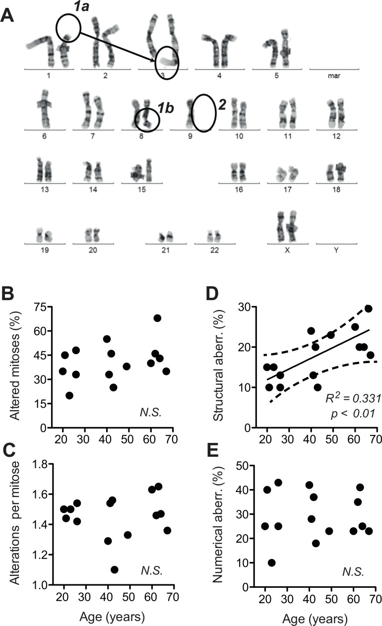 To address this question, we subjected the cells to classical cytogenetic analysis. We observed a high incidence of non-clonal chromosome aberrations. About 20% of the mitoses were abnormal and exhibited a variety of abnormalities (Fig. 3B). On average, we found more than one chromosomal aberration per abnormal mitosis (Fig. 3C). The overall frequency of chromosome abnormalities was not sign ificantly correlated to donor age. However, upon differentiation between structural and numerical chromosome aberrations (examples see Fig 3A), we were able to detect a significant age-correlated increase in the incidence of structural aberrations suggesting enhanced chromosome breakage and translocation (Fig. 3D). In contrast, numerical aberrations indicative of mitotic dysfunctions did not increase with donor age (Fig. 3E). These observations suggested that ageing of dermal fibroblasts analysed ex vivo involves an increase in chromosome and chromatid breaks.