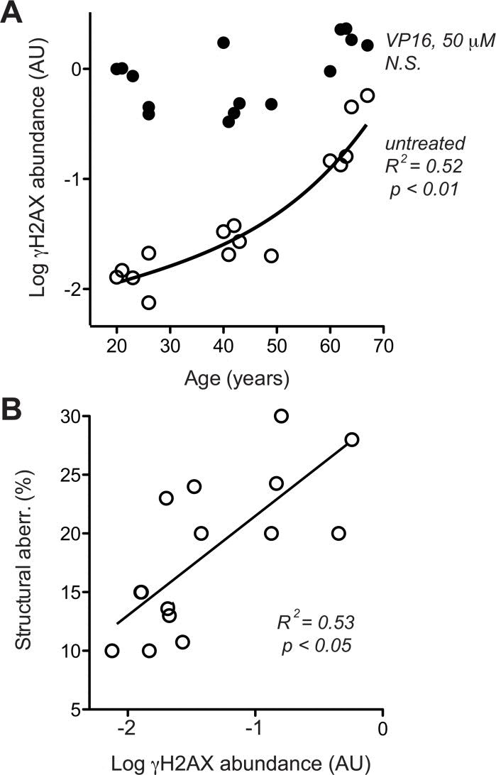 To compare base line level and maximal capacity of DSB-associated DDR, γH2AX was assessed with and without exposure to the radiomimetic drug etoposide (VP16), which was applied at a dose (50 μM) known to saturate DSB-elicited DDR in human cells [46]. Base line levels of γH2AX showed an age-related exponential increase, while the maximal response levels of γH2AX to 50 μM VP16 did not increase accordingly. As a consequence, the amplitude of the γH2AX response to VP16 declined from about 100-fold in cells from donors aged 20–30 years to less than 10-fold in cells from donors aged 60–70 years (Fig. 4A, please note log scale of y-axis). Moreover, across all cells tested, average base line levels of γH2AX showed a reasonable correlation with the percentage of cells bearing structural chromosome aberrations (Fig. 4B). These data suggest that age-related increases in chromosome breaks could indeed be due to an increase in base line DSB.