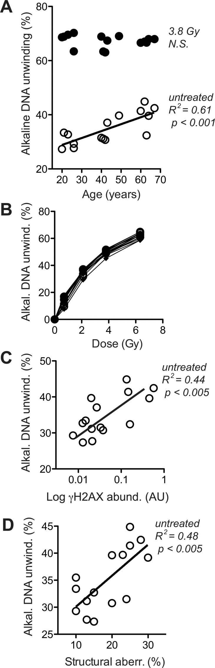 To corroborate that notion and distinguish whether the age-associated increase in γH2AX (Fig. 4A) was a primary alteration of DDR or a response to increased DSB, we directly assessed overall levels of DNA breaks. This was done by fluorimetric detection of alkaline DNA unwinding (so called FADU-assay) [45, 47, 48], which was measured before and immediately after exposure to ionising radiation (IR, 3.8 Gy). As shown in Fig. 5A, the extent of residual alkaline DNA unwinding before IR exposure increased with age, whereas the extent of additional DNA unwinding induced by IR was the same in cells from old and young donors. The latter observation indicates that the IR-susceptibility of the nuclear genome did not change during ageing, which was confirmed by the stringent overlap of IR dose-response curves of all donors (Fig. 5B). Therefore, the age-related increase in alkaline DNA-unwinding at base line seems due to an increase in residual DSB load unrelated to IR-sensitivity, and that increase could be the reason for the increase in base line γH2AX (Fig. 4A) and the spontaneous increase in chromosome breakage (Fig. 3D). The latter notion is supported by reasonably good correlations between residual alkaline DNA unwinding and base line γH2AX (Fig. 5C) as well as between residual alkaline DNA unwinding and the load of structural chromosome aberrations (Fig. 5D) across cells from all donors. In summary these data strongly suggest that age-correlated increases in base line DNA damage signalling and structural chromosome abnormalities are due to an increase in residual DSB load. However, it remained unclear why residual DSB load increases with donor age.