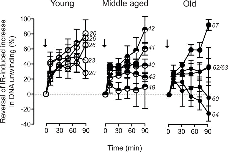 One possible explanation for the observed increase in residual DSB load would be a decrease of repair capacity. However, age-related down regulation of genes involved in telomere maintenance and -repair, chromosome segregation and chromosome maintenance (Fig. 1B), was frequently associated with up regulation of genes involved in DSB repair. This was most conspicuously the case in the samples from donors aged 62/64, which showed reduced expression of genes involved in telomerase regulation and the telomere-associated SLX4 complex, but at the same time exhibited increased expression of genes playing a prominent role in non-homologous end-joining (NHEJ). This combination is suggestive of a decreased efficiency in chromosome maintenance, which is partially balanced by increased DSB repair by NHEJ. We used the FADU assay to determine the kinetics of disappearance of IR-induced DNA strand breaks, which is considered a valid measure of DSB-repair activity and capacity [45]. Cells were challenged with 3.8 Gy, a dose inducing a half-maximal increase in alkaline DNA unwinding (Fig. 5B). Disappearance of that increase was then monitored over 90 minutes. The data were normalised to the initial IR-induced increase in alkaline DNA unwinding and plotted over time. Fig. 6 demonstrates these repair trajectories for the three age groups. It becomes apparent that the cells from young donors exhibited very similar, mostly overlapping repair trajectories resulting in the disappearance of 40 - 80 % of the IR-induced DNA unwinding (Fig. 6, left, open circles) within 90 min. Repair trajectories of the middle aged donor group (Fig. 6, middle, semi-closed circles) were more heterogeneous with endpoints ranging between 10–90 % disappearance of IR-induced DNA unwinding. Repair trajectories of the old donor group (Fig. 6, right, closed circles) appeared even more heterogeneous: In three specimen repair trajectories were similar as in the middle aged group with endpoints ranging between 40–95 % disappearance of IR-induced DNA unwinding, while the other two specimen exhibited the opposite, namely a progressive increase in DNA unwinding that went beyond the extent initially induced by IR (i.e. an aggravation of DNA damage over time). These results are in line with the gene expression heterogeneity depicted by the PCA and GSEA in Fig. 1: Two samples from old donors (63 and 67) clustered together with the middle aged and young donors. These cells exhibited a higher expression of genes related to cell cycle and DSB repair and had a similar or even better capacity to repair IR-induced DNA damage than the young group. In contrast, the other three specimen of the old group (60,62 and 64), which clustered separately from the young and middle-aged donors, exhibited a decreased expression of genes related to cell cycle and DSB repair, and were less efficient or even unable to repair IR-induced DNA damage (compare Fig. 1A and Fig. 6).