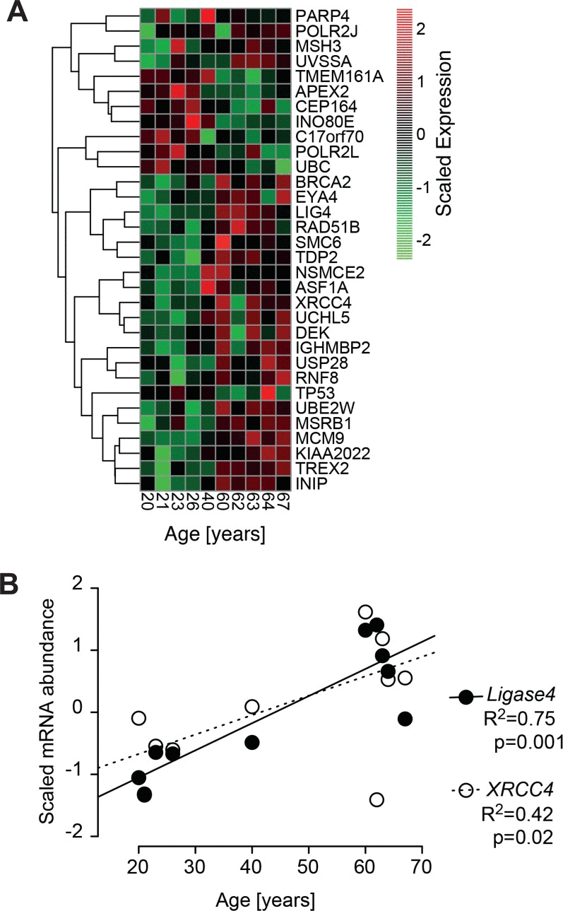 Thus, in some cases repair of DNA strand breaks became more efficient with age, whereas in other cases it became less efficient or even completely dysfunctional, and it remains unclear what determined this divergent outcome. It seems unlikely that age-correlated regulation of DNA repair genes is primarily involved, since, in line with the repair trajectory experiments (Fig. 6), GSEA revealed a heterogeneous age-related regulation of DNA repair related gene sets (Fig. 1B). Only 32 out of the 405 genes annotated with DNA repair processes were differentially regulated with age (Fig. 7A, robust linear regression. P-value < 0.05, R2 > 0.4). Please note that four donors from the middle aged group having a large body mass index and being outliers in the PCA (Fig.1A) were excluded from that analysis. Among the few repair genes consistently regulated with age, the down-regulated genes (CEP164 and TP53) are also related to the cell cycle. Thus, down regulation is probably associated with the age-related drop in proliferation demonstrated in Fig. 2B. In contrast, age-regulated genes only involved in DSB response and repair (EYA4, XRCC4 and LIG4) were up-regulated with age. Most notably, XRCC4 and LIG4 showed a linear, age-correlated increase in expression (Fig. 7B). These two genes code for rate limiting components of NHEJ, the major DSB-repair system available to human dermal fibroblasts at their normal G0 state [49]. However, despite the uniform, age-correlated up-regulation of these DSB-repair genes, some of the old cells failed in the repair of IR-induced DNA damage, while others excelled.