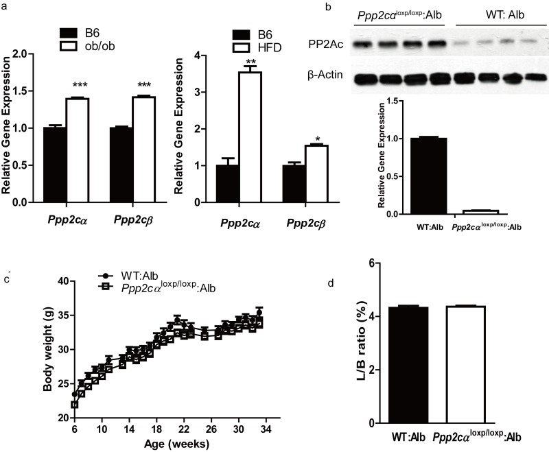 Previous work had indicated that PP2A has a negative effect on insulin metabolic signaling. To investigate more details about the association between Ppp2cα and insulin resistance in the liver, we first examined the expression of Ppp2cα in the livers of two mice models of obesity and type 2 diabetes, leptin-deficient ob/ob and high-fat diet (HFD) mice. As shown in Figure 1a, Ppp2cα mRNA level was significantly increased in these two models. Because total body loss of PP2Ac in mice results in early embryonic lethality at E6.5 phenotype, we generated mice with liver-specific Ppp2cα deletion by crossing Ppp2cαfl/fl mice with Alb:Cre mice, which specifically expressed Cre recombinase in the liver. Because Ppp2cα and Ppp2cβ share a 97% identity in their amino acid sequence, the PP2Ac antibody cannot distinguish these two isoforms of the C subunit. Therefore, we used RT-PCR to confirm the deletion of Ppp2cα allele in the liver (Figure 1b).