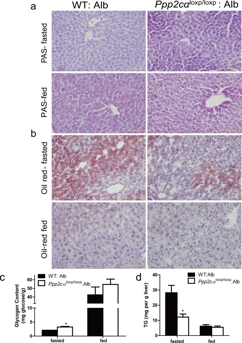 Impaired storage and utilization of glucose is an index of the pathophysiology of insulin resistance [28, 29]. Periodic acid Schiff (PAS) staining was used to analyze paraffin-embedded liver sections for glycogen storage from Ppp2cαloxp/loxp: Alb and control mice. The liver sections from the fasted ontrol mice displayed minimal glycogen content, whereas those from fasted Ppp2cαloxp/loxp: Alb mice exhibited elevated glycogen. The same trends of increased glycogen were observed in random fed mice (Figure 3a). In accordance with PAS staining, quantitative analysis of glycogen also showed that liver glycogen was enhanced in both fasted and random fed Ppp2cαloxp/loxp: Alb mice (Figure 3b). By contrast, histological analysis of liver sections from Ppp2cαloxp/loxp: Alb mice for lipid deposition using Oil Red O staining revealed depletion of lipid compared with WT: Alb mice. Therefore, we also quantified plasma triglyceride levels, which were significantly decreased in Ppp2cαloxp/loxp: Alb mice compared with control WT: Alb mice (Figure 3c).
