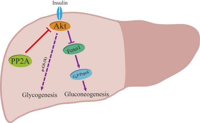 Protein phosphatase 2A (PP2A) is one of the most abundant serine/threonine phosphatases that plays an important role in the regulation of many proteins, including metabolic enzymes, hormone receptors, kinase cascades, and cell growth factor [14-17]. Several studies reveal that PP2A is involved in the metabolic actions of insulin. Okadaic acid, an inhibitor of PP2A, can activate glucose transport and GLUT4 translocation [18]. Expression of small t antigen has been demonstrated that inhibiting PP2A in 3T3-L1 adipocytes also stimulates GLUT4 translocation and glucose transport [19]. Inhibition of FFAs in hepato-cytes from ZDF rats can cause hepatic insulin resistance by increasing PP2A activity, which reduces Akt-mediated gene expression [20]. Hyperglycemia and insulin resistance are also induced by chronic hepatitis C virus infection through overexpression of PP2A thereby inhibiting Akt signaling [21, 22]. These conclusions raised the possibility that PP2A is a key regulator of insulin signaling in the liver and targeting PP2A may have therapeutic benefit in treating insulin resistance.