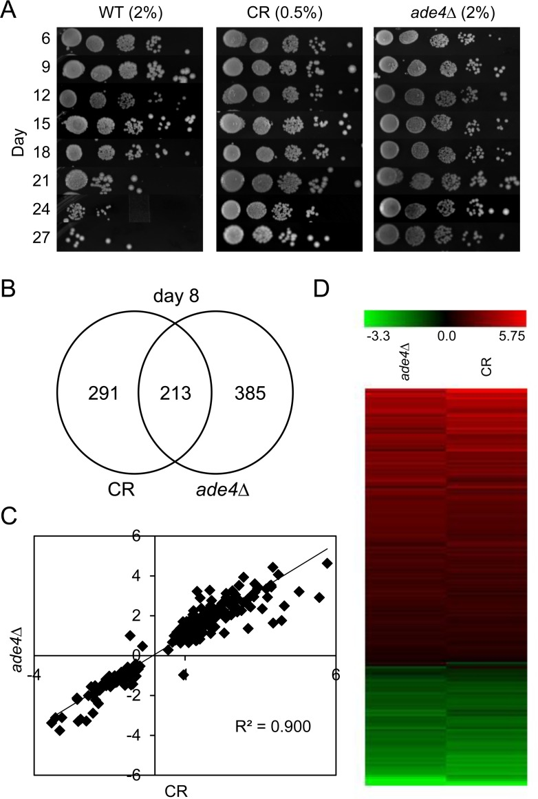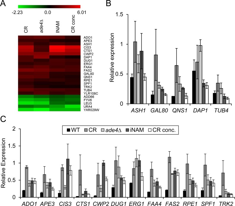 Total RNA was harvested from duplicate 10 mL BY4741 NR, CR, CR conc., INAM, and ade4∆ (SC, NR) cultures on day 8 using the acid phenol method [56]. The gene expression profile of each sample (4 μg RNA) was then determined by using Affymetrix Yeast Genome 2.0 GeneChip arrays as previously described [57]. Raw data from the CEL files were quantile normalized and expression values estimated using GCRMA in Bioconductor [58]. Lists of differentially expressed genes for all pair-wise comparisons (i.e. long-lived condition versus normal control) were derived using Limma [59], which applies a modified t-test, correcting for multiple hypothesis testing by applying False Discovery Rate (FDR) correction to the p-values [58] and applying a 20% FDR cutoff. Hierarchical cluster heat maps of differential expression levels (log2) between the long-lived conditions versus normal control samples of genes that passed the 20% FDR cutoff (y-axis) vs. long-lived condition (x-axis) were generated using TM4 MultiExperiment Viewer. The Affymetrix array data sets have been deposited in the NCBI Gene Expression Omnibus, and are accessible through GEO Series accession number GSE61341.