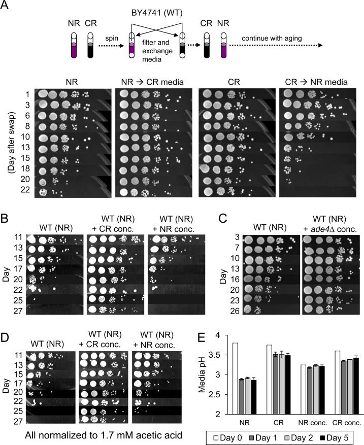 BY4741 was grown in 10 mL SC cultures with either 2.0% (NR) or 0.5% (CR) glucose at 30°C for 5 days. On day 5, cultures were centrifuged at 2,500 RPM in an Eppendorf 5810-R table-top centrifuge with a swinging buck rotor. The supernatants were collected and passed through a 0.2 micron filter to remove residual cells. The cell pellets were then resuspended in the opposite sterilized culture supernatant and the swapped cultures allowed to age at 30°C in the roller drum. Semi-quantitative CLS assays were then carried out at the indicated time points.