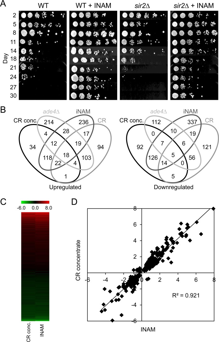 For the purpose of biomarker identification, we were interested in adding a 4th long-lived growth condition for gene expression profiling that was unrelated to the CR concentrate. Isonicotinamide (INAM) is an isomer of nicotinamide that has been reported to enhance the NAD+-dependent histone deacetylase activity of sirtuins [21]. Although initially interested in its ability to promote Sir2 activity [22], we have also discovered the same concentration of INAM (25 mM) that enhances Sir2 activity in vivo also dramatically extends CLS, though independently of Sir2 or the other yeast sirtuins (Figure 3A and data not shown). Affymetrix expression profiles for the INAM and the CR concentrate were then generated from day 8 cultures for comparison with the CR and ade4∆ datasets.