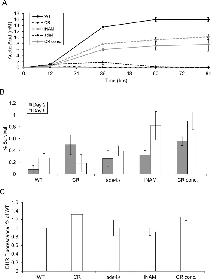 Technical differences in cell culturing that affect aeration levels and media evaporation rates appear to impact CLS in synthetic medium [11, 16]. In our hands, the extracellular acetic acid concentration using 15 ml glass culture tubes on a roller drum reaches a maximum of 10 to 16 mM with BY4741 growing in SC 2% glucose medium. While this concentration does not affect cell viability over a short-term exposure, it could have detrimental effects on viability long term under low pH conditions, such as stationary phase cultures, or especially specific hypersensitive mutants. Our results imply that acetic acid consumption and protection from toxicity both likely contribute to CLS during CR in SC medium, though they are not necessarily mutually exclusive. While CR and the ade4∆ mutation both promoted acetic acid consumption, INAM and the CR concentrate extended CLS without dramatically enhancing acetic acid consumption, though there was still a significant small reduction in overall accumulation in the media (Figure 4A). Despite the strong link in our study between CLS and acetic acid, there are clearly other mechanisms of CLS extension that do not involve acetic acid, including direct increases in mitochondrial respiration and adaptive ROS signaling [41, 42], which is consistent with the moderately increased ROS levels we observed with CR or the CR concentrate (Figure 4C).