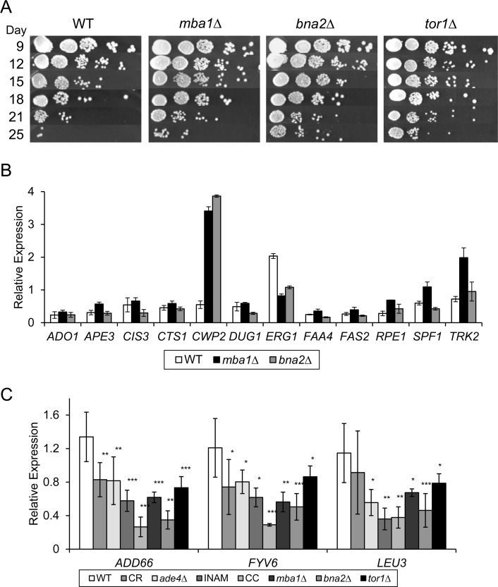 Success at validating biomarkers improved with the 3 confirmed downregulated genes - LEU3, ADD66, and FYV6. Similar to the initial 4 long-lived conditions, expression of all three genes was downregulated in the mba1∆ and bna2∆ mutants on day 8 (Figure 6C). For additional validation we measured expression of the downregulated genes in a tor1∆ mutant that was well known to extend CLS [10]. Expression of LEU3, ADD66, and FYV6 was also reduced in the tor1∆ mutant (Figure 6C), making it possible that down-regulation of these 3 genes is a common feature of chronologically long-lived yeast strains, and suggesting they could be used as biomarkers for future screening purposes.