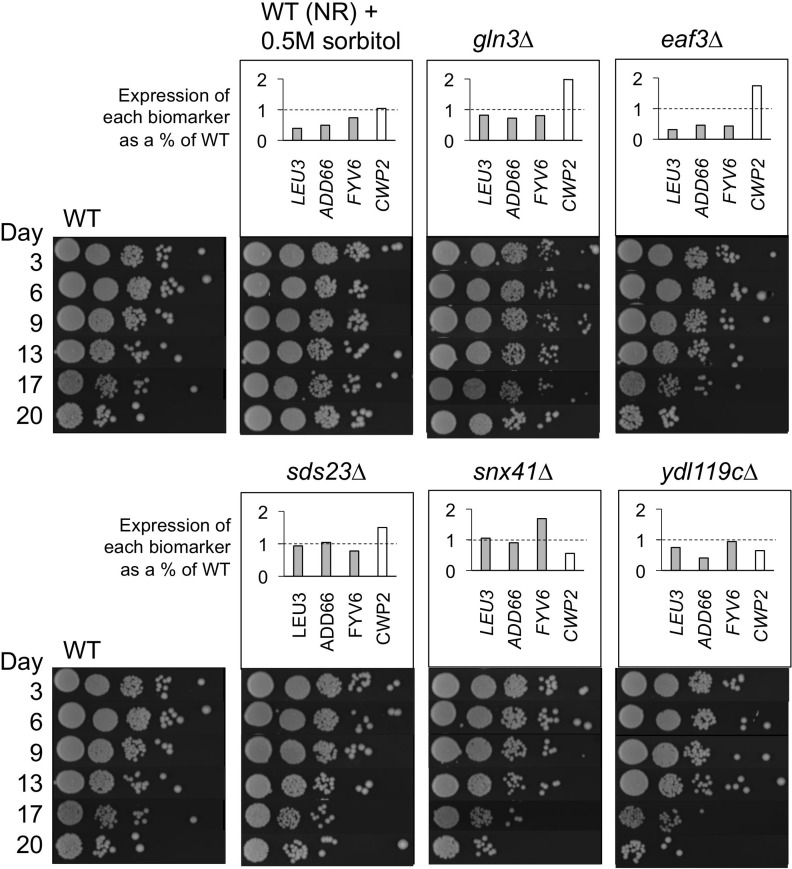 We chose 2 independent means of extending CLS for this experiment. A long-lived gln3∆ mutant was used and the WT BY4741 strain was also treated with 0.5M sorbitol to extend CLS by osmotic stress [25]. Four single gene deletion strains of unknown chronological lifespan were also randomly selected from the BY4741 knockout collection (snx41∆, eaf3∆, ydl119c∆, and sds23∆). Each test strain and the BY4741 control were grown in 2 sets of biological triplicates (10 mL SC 2% glucose media). Each triplicate set was assigned an independent, random numerical value by a third party. The CLS of one set of cultures was assessed using the semi-quantitative CLS assay, and the other was used for measuring the relative mRNA expression of each of the putative biomarkers LEU3, ADD66, FYV6, and CWP2 using qRT-PCR (described above) on day 8. The average expression values for each set of unknown triplicate was then normalized to the known WT expression values. Those samples with normalized values <1 for the downregulated biomarkers (LEU3, ADD66, and FYV6) and >1 for the upregulated biomarker (CWP2) were predicted to correspond to the long-lived samples of the first set.