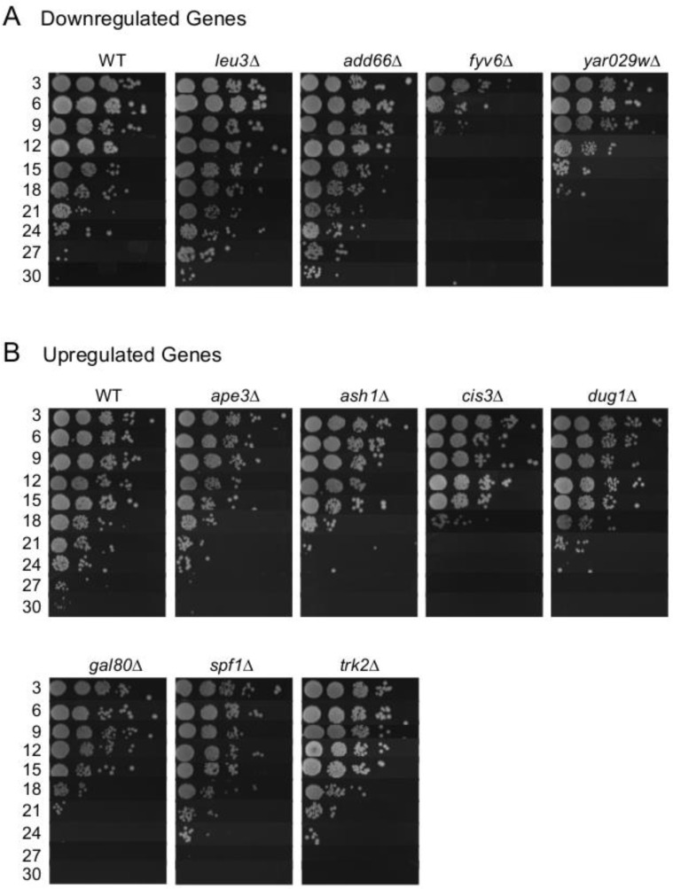The upregulated genes we tested for functional relevance had less variation in their CLS effect. Of the 12 tested deletion mutants, 8 had a measurable impact on CLS (Figure 8B). Of these 8 mutants, 7 had reduced CLS relative to WT, which was anticipated if up-regulation of these genes was beneficial to stationary phase survival. However, none of the CLS reductions were severe compared to WT (all mutants persisted until day 18 at least), making it unlikely that any of these factors are individually major contributors to stationary phase survival. Instead, the data are consistent with the idea that yeast chronological lifespan is defined by a complex combination of numerous factors, and is a highly multigenic process regulated at the transcriptional level.