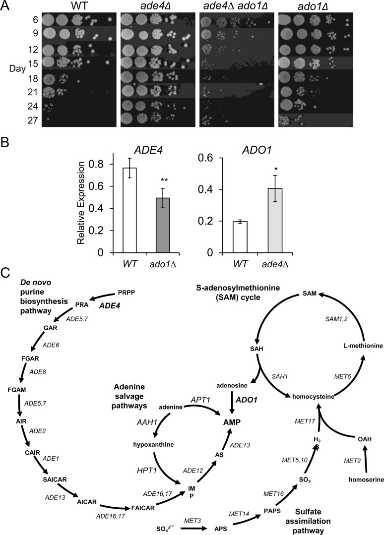 The only shared upregulated gene to cause CLS extension when deleted was ADO1 (Figure 9A), which encodes an adenosine kinase that salvages adenosine derived from the methyl cycle by converting it to AMP [29]. Ado1 also converts 5-amino-4-imidazole-carboxamide ribonucleoside (AICAR) into the active phosphorylated form [30]. While the extended CLS for this mutant was weaker than deletions of de novo purine biosynthesis genes such as ade4∆ (Figure 9A), it was similar to the effects of deleting APT1 or AAH1 [9], both of which are involved in salvaging adenine to produce AMP (see adenine salvage pathway in Figure 9C). We had earlier proposed that the modest lifespan extension caused by mutants such as apt1∆ or aah1∆ was possibly due to secondary effects on expression of the de novo purine synthesis pathway [9]. To test this idea for the ado1∆ mutant, we analyzed the effect of this mutation on ADE4 expression and found it to be reduced at day 8 (Figure 9B), consistent with such a model. On the other hand, up-regulation of ADO1 in the ade4∆ mutant (Figure 5C and 9B) suggested that adenosine salvage from the methyl cycle was important in compensating for loss of de novo purine biosynthesis. Indeed, deleting ADO1 completely blocked the ade4∆-induced CLS extension, with the double mutant having a CLS even shorter than WT (Figure 9A). Eliminating two pathways to AMP synthesis was apparently too detrimental for proper stationary phase survival.
