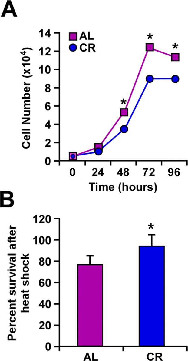 Proliferation of B16F10 melanoma cells was carried out in the presence of serum from rats fed either AL or CR diet. A significant reduction in cell growth was observed following incubation with CR serum as compared to AL serum controls (Fig. 1a). Exposure of B16F10 cells to heat stress (45°C) for 1 h caused a significant difference in survival depending on whether these cells were maintained in CR or AL serum (Fig. 1b). Our observations that CR serum decreased heat-dependent cellular cytotoxicity support previously published results from this laboratory [23].