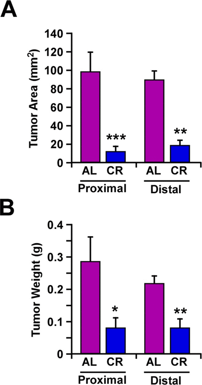 Reduction in the number and size of tumors in mice on caloric restriction