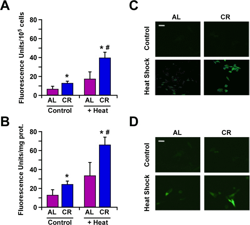 Changes in HSP expression play an important role in the ability of cells to respond to environmental stressors. Earlier work has shown an elevation in Hsp70 expression in B16F10 melanoma cells cultured with serum from CR-fed animals [23]. Here, we compared the effects of CR alone, heat shock alone or the combination ‘CR + heat shock’ using B16F10 melanoma cells stably expressing GFP-tagged Hsp70 construct under the control of rat hsp70.1 promoter [24]. The results indicate that the heat-mediated induction of Hsp70 expression was significantly higher when B16F10 cells and tumor-bearing animals were subjected to CR (Fig. 3).