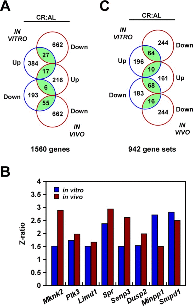 Microarray results reinforce the idea that despite significant genome-wide gene expression variation between the two experimental models, the expression profile of several transcripts implicated in tumorigenesis and stress response exhibited a comparable pattern, whether B16F10 melanoma cells were cultured in CR serum or implanted in mice fed a CR diet. Although this in vitro model is quite distant from a physiological setting, it displayed a number of molecular pathways similar to the ones observed in vivo.