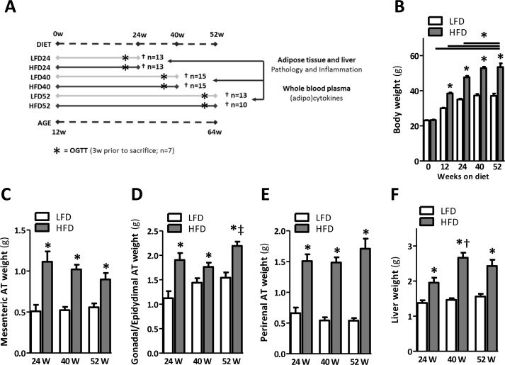 Body weight and AT mass were measured in mice fed a LFD and HFD for 24, 40 and 52 weeks, at the age of 36, 52 and 64 weeks respectively (Fig. 1A) to assess the development of obesity over time. As expected, we observed a rapid increase in body weight in mice fed a HFD, which was significant from 12 weeks following a diet onwards (Fig. 1B). Body weight gradually increased between mice fed a HFD for 24 weeks and 40 weeks (Fig. 1B; p<0.001) and remained at the same level in mice fed a HFD for 52 weeks compared to HFD for 40 weeks (Fig. 1B). In addition, weights of the mesenteric, gonadal/epidydimal and perirenal fat depots were significantly increased in mice fed a HFD for 24, 40 and 52 weeks as compared to their age-matched LFD controls (Fig. 1C-E). We observed no difference in all three fat depots between mice fed a HFD for 24, 40 or 52 weeks (Fig. 1C-E), suggesting a steady degree of adiposity following its initial establishment. Liver weight was significantly higher in mice fed a HFD for 24, 40 and 52 weeks as compared to LFD controls (Fig. 1F).
