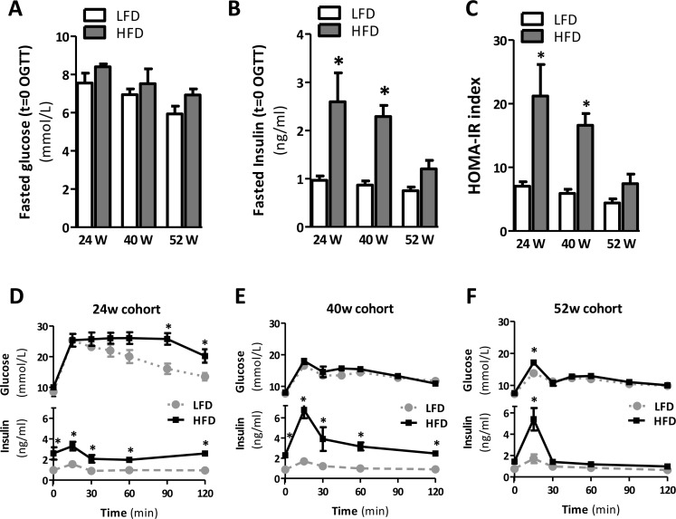 Since obesity is associated with IR, we next monitored insulin sensitivity in mice fed a HFD for 24, 40, and 52 weeks. In mice fed a HFD at all points in time the fasted glucose levels were not affected (Fig. 2A), but fasted insulin levels in mice fed a HFD for 24 and 40 weeks were significantly elevated (Fig. 2B), suggesting a reduction in insulin sensitivity in these mice. Furthermore, we performed an oral glucose tolerance test (OGTT) and measured glucose and insulin levels simultaneously during the OGTT. At 24 weeks of HFD feeding, glucose tolerance was negatively affected, as evidenced by elevated glucose levels during the OGTT (Fig. 2D; p<0.01 at t=90 and p<0.05 at t=120, Suppl. 1A; p<0.05) when compared to age-matched LFD controls. Furthermore, insulin levels were significantly increased in 24-week HFD fed mice compared to age-matched LFD controls (Fig. 2D, Suppl. 1B), confirming the existence of IR at this point in time. Whole-body glucose tolerance was also significantly impaired in mice fed a HFD for 40 weeks, as mice displayed elevated insulin levels during the OGTT (Fig. 2E, Suppl. 1B), whereas blood glucose levels remained stable (Fig. 2E, Suppl. 1A). In contrast, we observed no signs of apparent glucose intolerance in mice fed a HFD for 52 weeks, as glucose levels did not differ (Fig. 2F, Suppl. 1A) and plasma insulin was significantly increased only after 15 min following gavage (Fig. 2F, Suppl. 1B). In support of the glucose tolerance data, homeostasis model assessment of IR (HOMA-IR) showed values to be significantly higher in the 24- and 40-week HFD-fed mice as compared to their age-matched LFD controls (Fig. 2C); this suggests a state of IR in mice fed a HFD for 24 and 40 weeks. HOMA-IR was not increased in mice fed a HFD for 52 weeks, confirming the absence of IR in these mice (Fig. 2C).