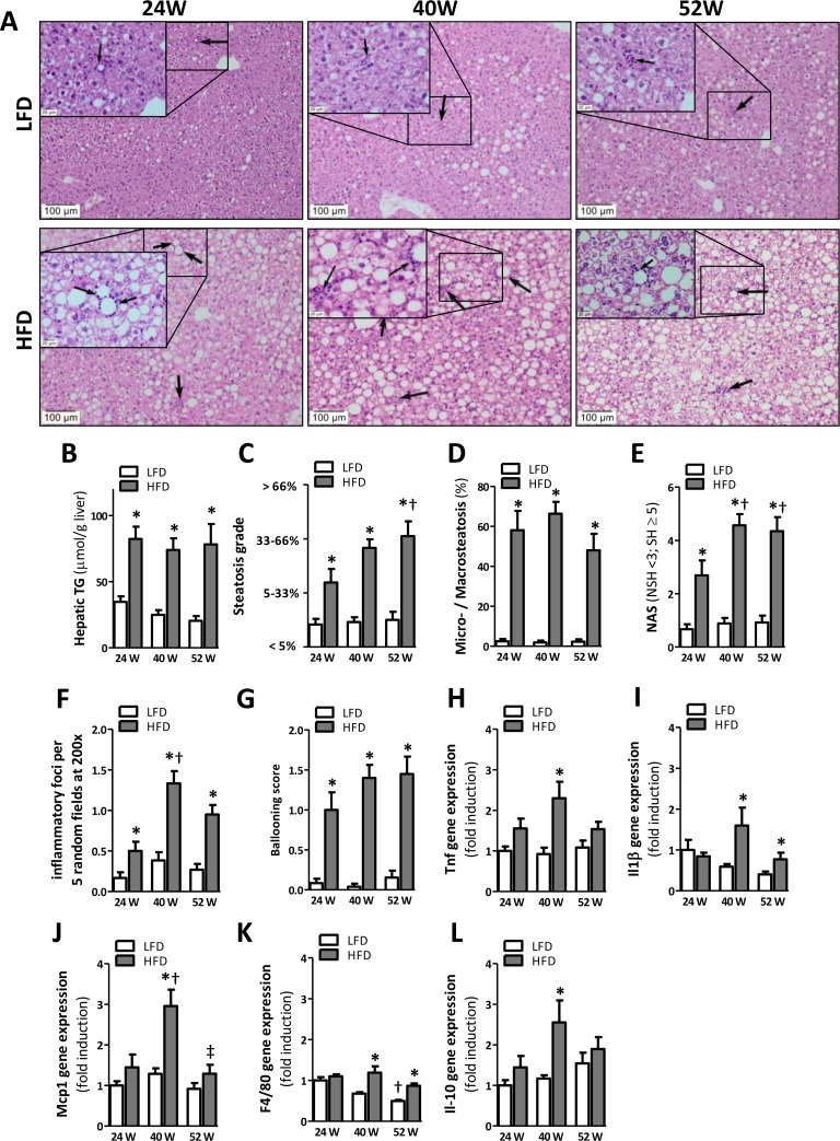 Furthermore, we observed a significant increase in the NAFLD activity score (NAS) (Fig. 4E), the number of inflammatory foci (Fig. 4F) and hepatocellular ballooning (Fig. 4G) for all HFD groups as compared to LFD groups. In line with a progression in steatosis grade, we also observed an increase in both the NAS score (Fig. 4E; p<0.05) and the number of inflammatory foci (Fig. 4F; p<0.001) in mice fed a HFD for 40 weeks as compared to the 24-weeks HFD group. To further investigate inflammation we measured the expression of pro- and anti-inflammatory cytokines (Tnf, Il1ß, Il-10) and macrophage markers (Mcp1, F4/80) in the liver. Tnf, Il1ß, Il-10, Mcp1, and F4/80 expression was significantly upregulated at 40 weeks of HFD-feeding but not 24 weeks of HFD-feeding compared to mice fed the LFD. Furthermore, no difference was observed in expression level of Tnf, Mcp1 and Il-10 at 52 weeks of HFD-feeding, whereas Il1ß and F4/80 were still significantly elevated at this time point (Fig. 4H-L). In addition, Mcp1 expression was significantly reduced in HFD52 mice compared to HFD40 mice (Fig 4I). We also observed an age-related decline in F4/80 expression as represented by a significant reduction in F4/80 in LFD52 mice compared to LFD24 mice (Fig. 4K).