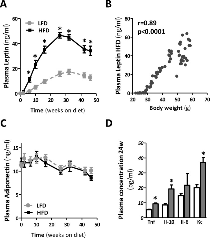 Both leptin and adiponectin are associated with obesity, IR and T2D. To investigate the extent to which prolonged HFD-feeding mediates the secretion of leptin and adiponectin, we measured the plasma levels of these adipokines throughout the dietary period. As expected, leptin was significantly increased in mice fed a HFD compared to LFD, reaching a maximum around 24 weeks (Fig. 5A). Plasma leptin concentrations exhibited very strong correlation with body weight (Fig. 5B). Serial adiponectin levels did not change in time or as a result of HFD-feeding (Fig. 5C). After 24 weeks of HFD, the circulating pro-inflammatory mediators, TNF, IL-6, and mKC, as well as the anti-inflammatory mediator IL-10 were up-regulated (Fig. 5D), confirming immunological activation in HFD-fed mice.