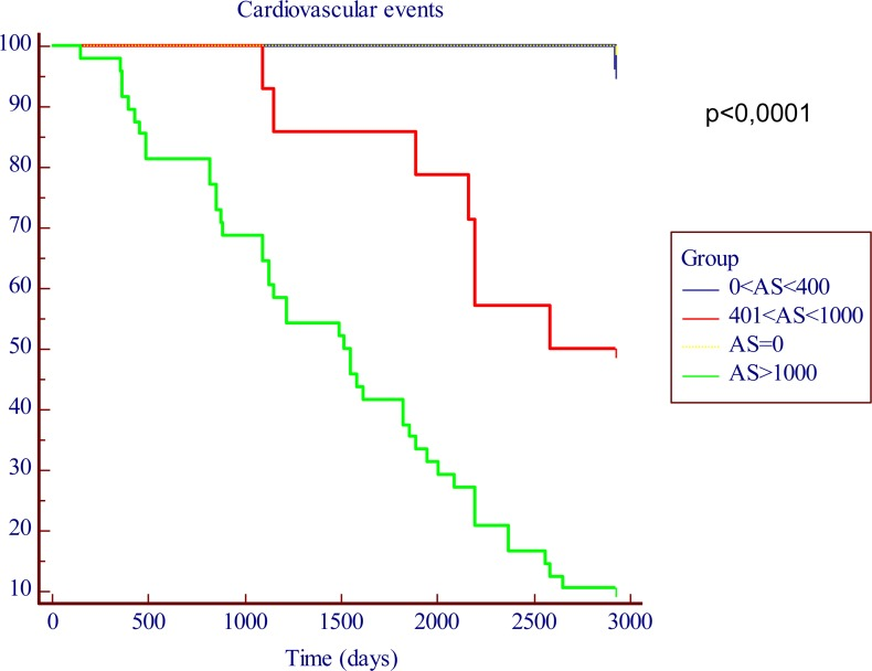 One-hundred two patients (49.7%) had a CV event during the seven year follow-up period. Kaplan-Meier survival analysis is shown in Figure 1. Seven-year actuarial survival exceeded 90% among patients of groups 1 (AS=0) and 2 (AS≤400), but fell to about 50% in patients of group 3 (400