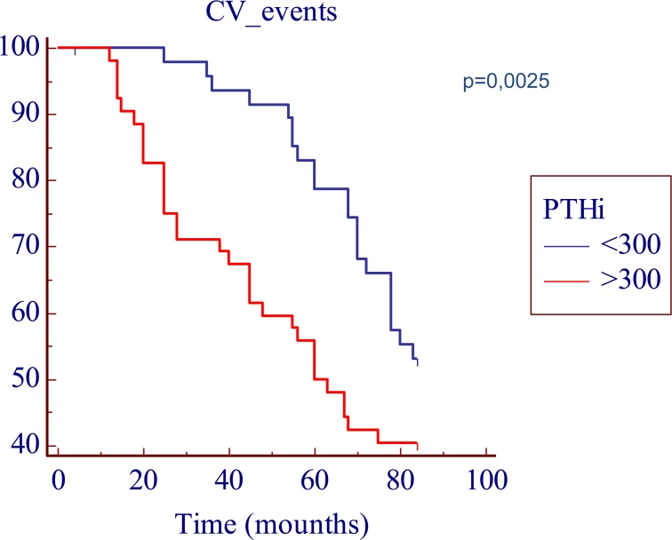 We found a predictive role, both for an higher AS and an higher CV mortality, linked to the serum iPTH levels; in fact, as shown in Table 1, the iPTH values were significantly higher in pts with an AS > 400 (451 pg/L, [range 2.43 to 2500 pg/L] vs 383 pg/L [range 61 to 1498 pg/L], p < 0.05); furthermore the Kaplan-Meier analysis showed a significantly decreased seven-year actuarial survival (p < 0.05) in patients with iPTH levels > 300 pg/L compared to patients with iPTH levels < 300 pg/L (Figure 2).