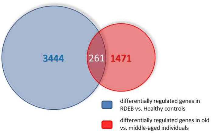 The number of genes (including different known splicing variants derived from individual genes) on the microarray is 38,400. Only a relatively small fraction (978) was found in the middle aged/elderly difference list and in the RDEB/healthy difference list (2447). Comparing these two groups, an overlap list (SI Table I) containing 261 genes was detected. The criterion for inclusion in the list was i) at least two-fold under- or overexpression in both situations compared, and ii) under- or over-expression in the same direction in both situations. The Venn diagram of Fig.1 visualizes these numbers. The probability to find these 261 genes was calculated with an online available tool (http://nemates.org/MA/progs/overlap_stats.html) resulting in a representation factor of 4.2 with a p-value of < 2.209e−93, excluding the possibility that the genes in the overlap were found by chance.