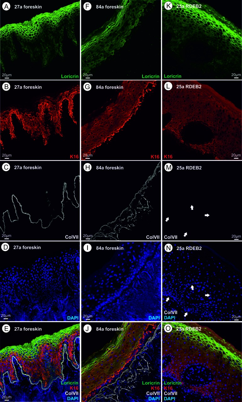 Frozen skin tissue was mounted in a cryostat (HM 550, Microm, Walldorf, Germany) and cross sections of 12 μm were collected on adhesion slides (Superfrost Plus; Thermo Scientific, Wien, Austria) and air-dried for 1 hour at RT. After a 5 min rinse in TRIS-buffered saline (TBS; Roth, Karlsruhe, Germany) sections were fixed in phosphate buffered saline (PBS) containing 4% para-formaldehyde (PFA) for 15 min. After three 5 min rinses in TBS, sections were incubated for 1 hour at RT in TBS containing 5% donkey serum (Sigma-Aldrich, Wien, Austria), 1% BSA (Sigma-Aldrich), and 0.5% Triton X-100 (Merck, Darmstadt, Germany). After a 5 min rinse, slides were incubated for triple staining with mouse anti human collagen VII (1:100, Millipore MAB 4315, monoclonal), rabbit anti human Loricrin (1:500, Covance PRB-145P, polyclonal serum) and goat anti human Cytokeratin 16 (C-12) (1:100, Santa Cruz sc-49176, polyclonal serum) in TBS/BSA/TritonX-100 over night at RT. Additionally a polyclonal rabbit anti collagen VII antibody (1:500, Abcam, ab93350) was used to detect fragmented or shortened collagen VII proteins. After a rinse in TBS (three times, 5 min) binding sites of primary antibodies were visualized by corresponding AF488, AF555 and AF647 tagged antisera (1:1000; Invitrogen, Karlsruhe, Germany) in TBS, containing 1% BSA and 0.5% Triton X-100 (1 hour at RT) followed by another rinse in TBS (three times, 5 min). Slides were incubated 10 min with 4′,6-Diamidino-2 phenylindol dihydrochloride (DAPI) (1:4000, stock 1 mg/ml, VWR, Vienna, Austria), rinsed three times 5 min in PBS and were embedded in TBS:glycerol (1:1 at pH 8.6).