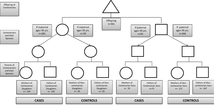 Ashkenazi Jewish individuals with exceptional longevity (centenarians), characterized by living independently at age 95 years, which was considered a reflection of good health, were recruited from the Northeastern United States for the Longevity Genes Project at Albert Einstein College of Medicine beginning in 1998, as previously described [15]. As part of this study, the offspring of centenarians were also recruited and completed a structured questionnaire that included information about the ages of death of their parents (centenarians and their spouses), as well as the ages of death of their grandparents (centenarians’ and their spouses’ parents). The parents of centenarians were deemed as cases (Figure 1). The parents of spouses were considered controls, provided that the spouse did not achieve age 95 or greater (Figure 1). Seven couples were identified where both partners were centenarians. The use of the questionnaire completed by the offspring to ascertain the ages of both case and control groups was beneficial to reduce recall bias and ensure similar environmental factors within the family units.
