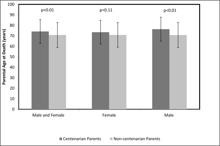 Age of death of both parents was reported for 224 female centenarians, 63 female non-centenarians, 69 male centenarians and 156 male non-centenarians. The average parental age of death was significantly higher among the parents of the centenarian cohort than among the parents of their control counterparts, 74.2 ± 11.4 years and 70.8 ± 11.9 years, respectively, p<0.01 (Figure 2). After stratifying the centenarian and control cohorts by gender, this trend persisted only among the males, with the mean parental age of death of male centenarians being 76.4 ± 11.4 years and of male non-centenarians being 70.8 ± 12 years, p<0.01 (Figure 2). An analysis that compared the mean age of death of the parents of female centenarians and female non-centenarians did not find significant differences, with the mean parental lifespan being 73.5 ± 11.5 years and 70.9 ± 11.7 years, p=0.11, respectively (Figure 2).