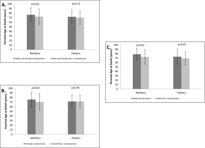 An analysis that stratified the parents by gender demonstrated that the mothers of centenarians had longer average lifespan compared to the mothers of non-centenarians, with the mean age at death of the mothers of centenarians being 76.4 ± 15.3 years and the mean age at death of the mothers of non-centenarians being 72.3 ± 16.8 years, p<0.01 (Figure 3A). The average lifespan achieved by the fathers of centenarians was 72.0 ± 15.0 years compared to 70.0 ± 14.6 years achieved by fathers off non-centenarians, p=0.12 (Figure 3A).