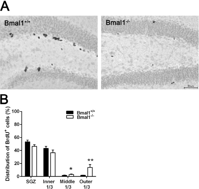 In both genotypes, the majority of BrdU-positive cells were located in SGZ (Bmal1+/+: 53.3±2.7%; Bmal1−/−: 46.4±2.5%) and inner third of GCL (Bmal1+/+: 43.2±3.1%; Bmal1−/−: 36.6±4.2%). In Bmal1−/− mice, a significantly larger fraction of BrdU-positive cells was located in the middle third (Bmal1+/+: 1.7±0.5%; Bmal1−/−: 3.1±0.5%) (P=0.026) and the outer third (Bmal1+/+: 1.7±0.3%; Bmal1−/−: 13.9±4.5%) (P=0.004) as compared to Bmal1+/+ mice (Fig. 2A, B).