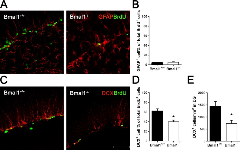 In order to differentiate precursor subtypes, BrdU was co-labelled with GFAP (for detection of early neural progenitors) or DCX (for detection of type2b and type 3 progenitors) [41]. In both genotypes, only a small fraction of BrdU positive cells were co-labelled with GFAP. We found no significant difference in the percentage of BrdU/GFAP-co-labeled early neural progenitors between Bmal1−/− mice (5.3±1.04%) and Bmal1+/+ mice (4.4±0.96%) (P=0.699) (Fig. 3A, B), suggesting that Bmal1-deficiency did not affect the proliferation of early neural progenitors. However, the percentage of cells co-labeled with BrdU and DCX was significantly larger in Bmal1+/+ mice (61.9±4.6%) as compared to Bmal1−/− mice (39.7±3.6%) (P=0.015) (Fig. 3C, D). Moreover, the total number of DCX positive cells/developing neurons was significantly reduced in Bmal1−/− mice (729.8 ± 133.6) as compared to Bmal1+/+ mice (1440 ± 202.3) (P=0.032) (Fig. 3E). These findings denote that specifically the pool of DCX-positive type 2b and type 3 progenitors was affected in Bmal1−/− mice.